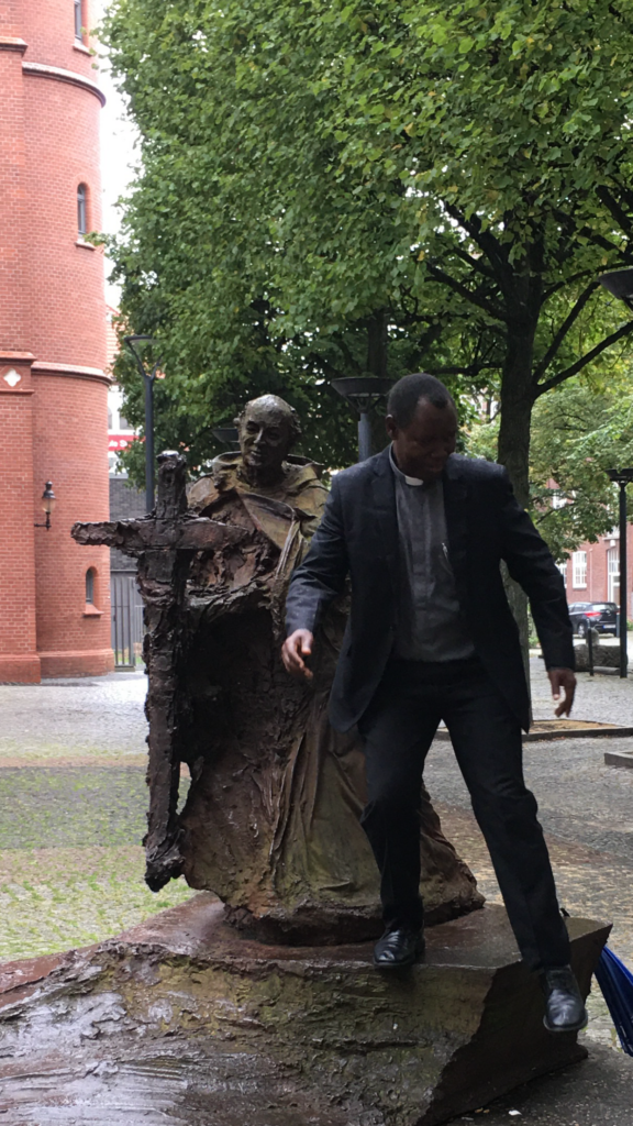 Am Dienstag trafen wir uns dann in Hamburg um an den Festlichkeiten des Tages der Deutschen Einheit teilzunehmen. Vorher gab es jedoch einen fröhlichen Austausch über das, was man bisher erlebt hatte und was es an früheren Erlebnissen bei gegenseitigen Besuchen gab. Danach zeigten wir unseren Gästen eines unserer Kolpingjugendhäuser. Auch ein Besuch im Dom durfte nicht fehlen. Auf dem Vorplatz trafen sich dann Ansgar Shumbusho, Nationalpräses von Kolping Tansania, und der heilige Ansgar zu einem Foto. Im Dom wurde erstmal inne gehalten und gebetet und dann auch das Kolumbarium besichtigt. Als Nächstes wollten wir uns dann in das Getümmel der Mönckebergstraße stürzen, wo die Bundesländer ihre Stände aufgebaut hatten, stürzen. Leider war das Wetter uns nicht so gut gesonnen, so daß wir früher als geplant wieder in unsere Quartiere fuhren. Aber auch dort gab es regen Austausch bei den einen mit Whisky oder Bier bei den anderen mit Federweißen.